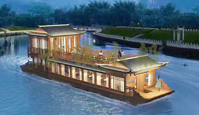 畫舫船就是裝飾古典華麗的游船,是"中國風"的仿古游船,結合古典園林建筑,體現了中華文明的古典藝術.畫舫船豪華而又古典,船上的建筑按照中國古代建筑里的亭臺樓閣,建筑工藝之復雜,要求之嚴格,仿古畫舫游船的特點飛檐翹角、玲瓏精致的四角亭子逐漸成形,赫然立于船頭,美人靠、盤龍柱子、彩畫……龍柱上的浮雕盤龍和祥云一層扣著一層,層層錯落有致,雕刻精細到盤龍身上的每一個鱗片都細細可數,古代皇家標志性元素,在畫舫船上體現的淋漓盡致。除了雕刻、花窗,整條船還有一個看點,那就是弧線優美、高高翹起的船尾。游船并不大,長約10米、寬3米,但是整體看起來堪稱一件藝術品。船尾的雕花欄桿與船艙、船頭的雕刻遙相呼應,船身四周貼著浮雕祥云,給整條船增添了富貴、華麗的氣質。